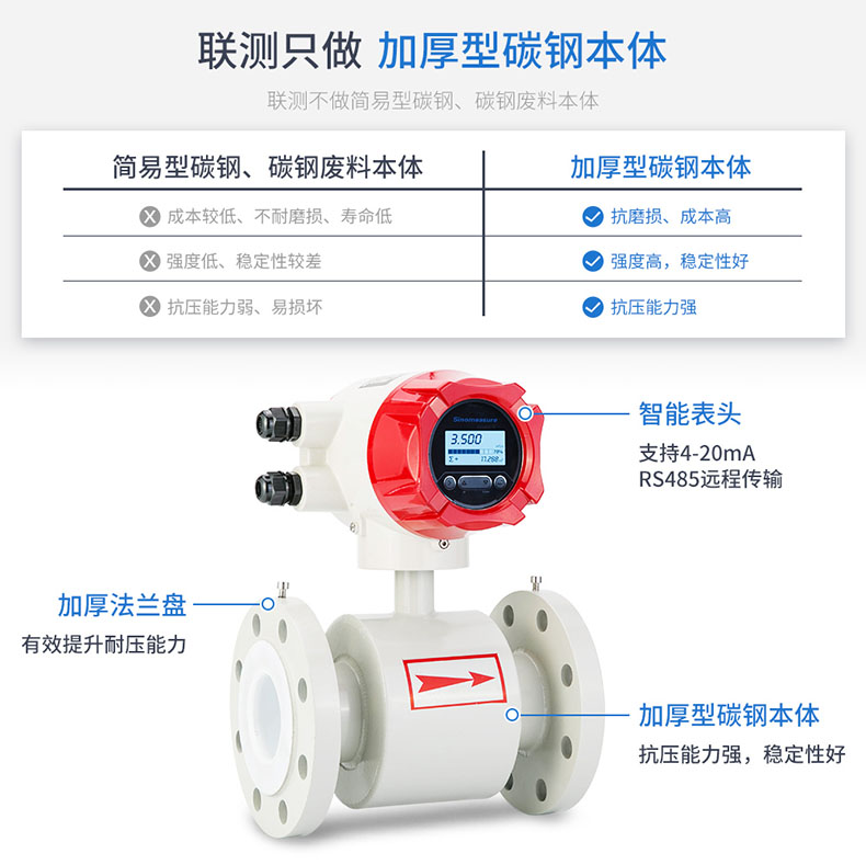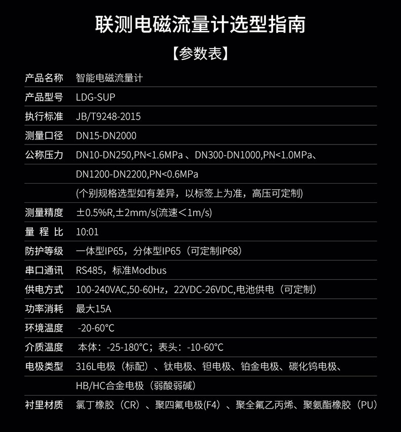 產品簡介:聯測LDG電磁流量計適用于化工助劑、海綿城市、給水排水、水利灌溉、水處理、污水處理(環保污水控制、化工污水、電鍍污水)、造紙漿液(紙漿)、泥漿、醫藥原料、食品等工農業的生產公司過程流量測量和控制,標配485通訊功能。