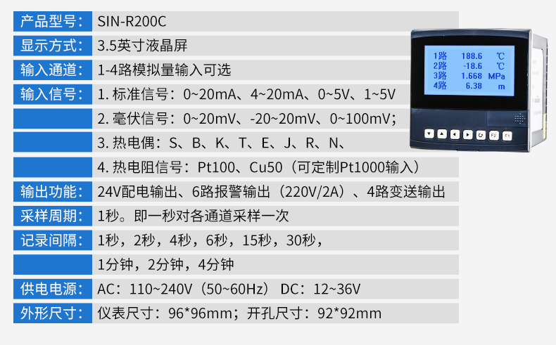 產(chǎn)品簡介:SIN-R200C顯示采用 3.5 英寸 高分辯率點陣式白屏黑字液晶屏,軟件上引入中文WINDOWS 的框架思路,并采用了數(shù)據(jù)壓縮技術。帶 USB 數(shù)據(jù)轉存功能,存儲時間最長可達 720 天。儀表全面采用了表面貼裝工藝,并采用多保護和隔離設計,抗干擾能力強,可靠性高。儀表可同時輸入 4 路萬能信號,輸入通道相互隔離,并具有報警控制、模擬變送、RS485/232 通訊等輸出功能,是一款功能齊全的漢顯儀。