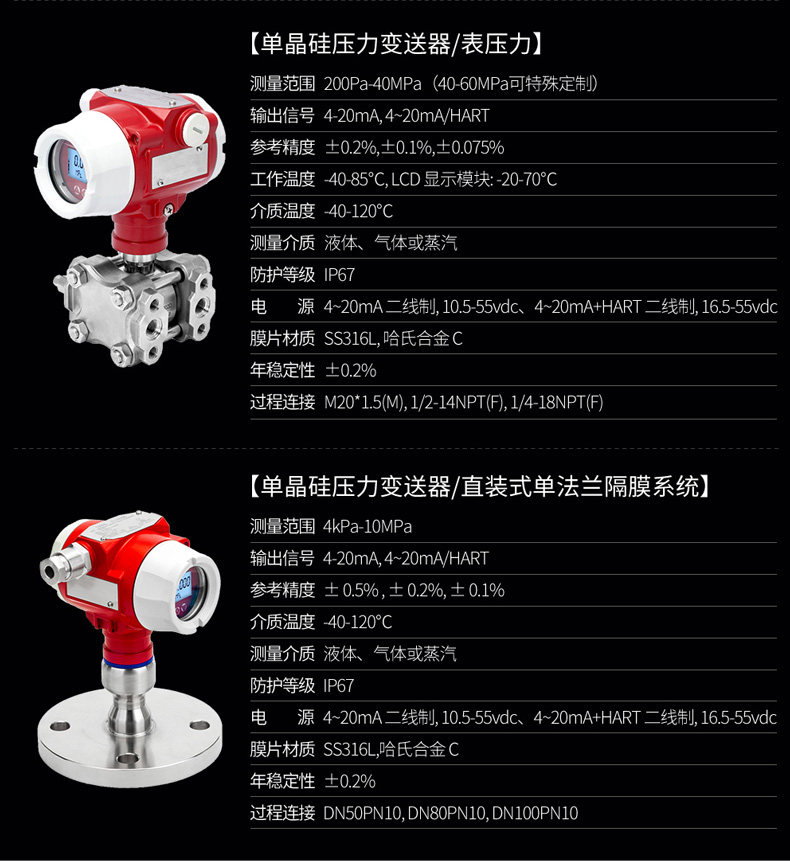 產品簡介:SIN-P3000單晶硅壓力變送器用于測量液體、氣體或蒸汽的液位、密度、壓力,然后將其轉變成4-20mAHART電流信號輸出,也可與HART375或BST Modem相互通信,通過他們進行參數設定、過程控制。與傳統壓力變送器的區別在于它使用的是納米單晶硅作為傳感器材料。
