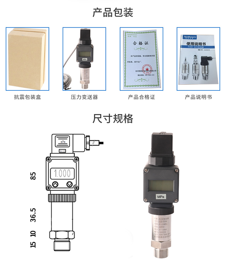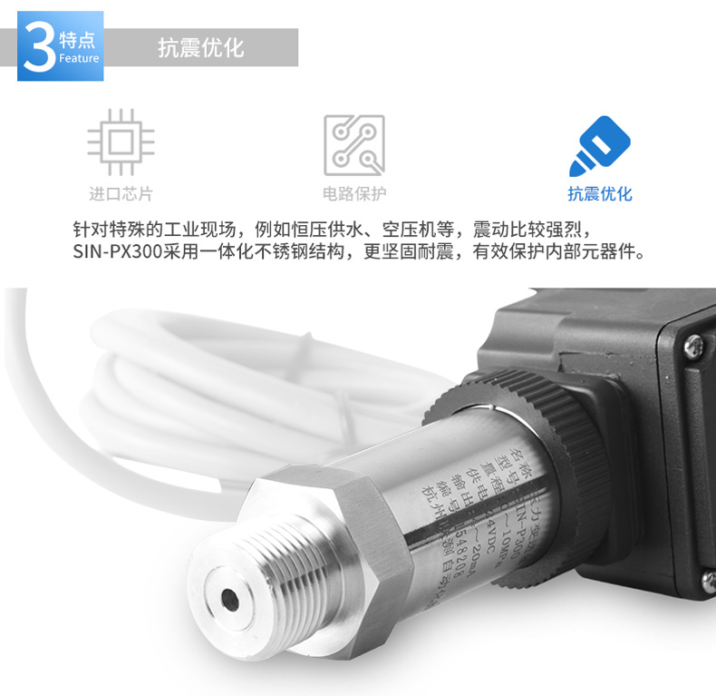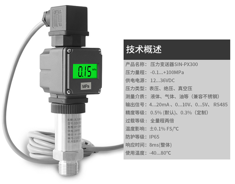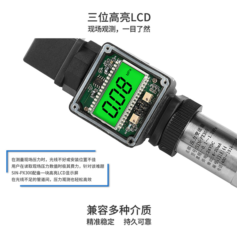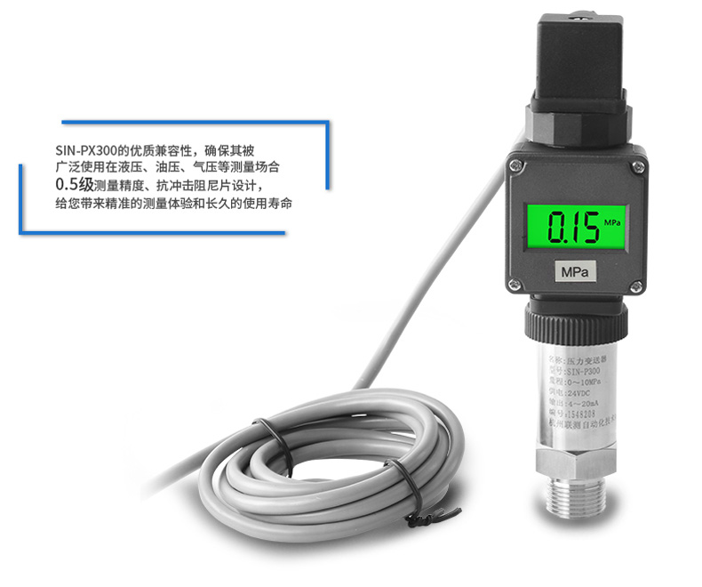 產品簡介:SIN-PX300型數顯壓力變送器采用無縫焊接結構,可批量化生產,經濟、可靠,具有良好的適應性,可應用于各種復雜的環境,該產品輸出形式多樣,壓力接口可提供定制,滿足您的使用需求。同時數顯壓力變送器帶有現場顯示功能,能夠更加直觀的顯示現場的壓力波動情況。廣泛應用于工業自動化設備配套以及石油、化工、冶金、電力等控制領域。