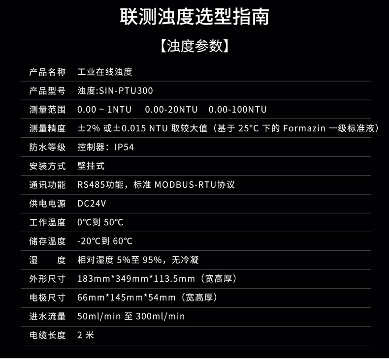 產(chǎn)品簡介:聯(lián)測_SIN-PTU300三個量程段規(guī)格,分別為0-1NTU量程段,0-20NTU量程段,0-100NTU量程段,其中0-1NTU量程段主要應(yīng)用出水濁度低、測量要求高的場合,其最低檢出限為0.015NTU,可穩(wěn)定監(jiān)測<0.1NTU水質(zhì),可配套小型凈水設(shè)備。